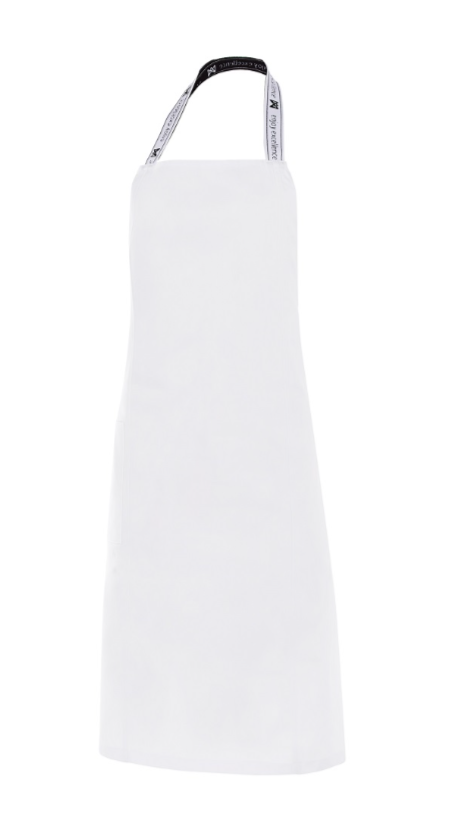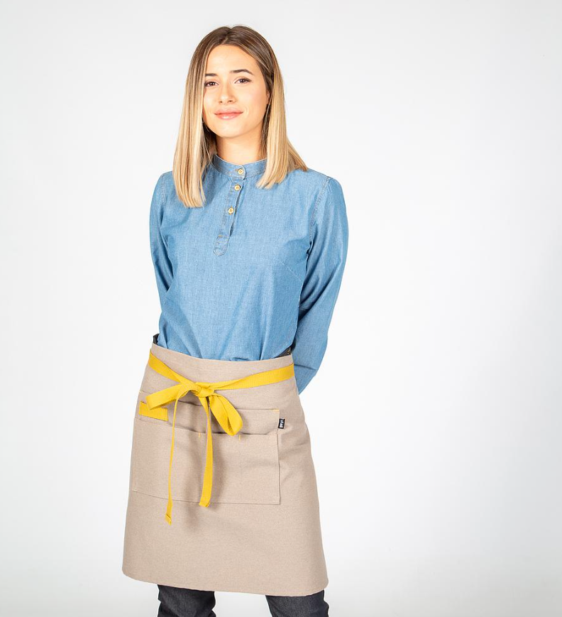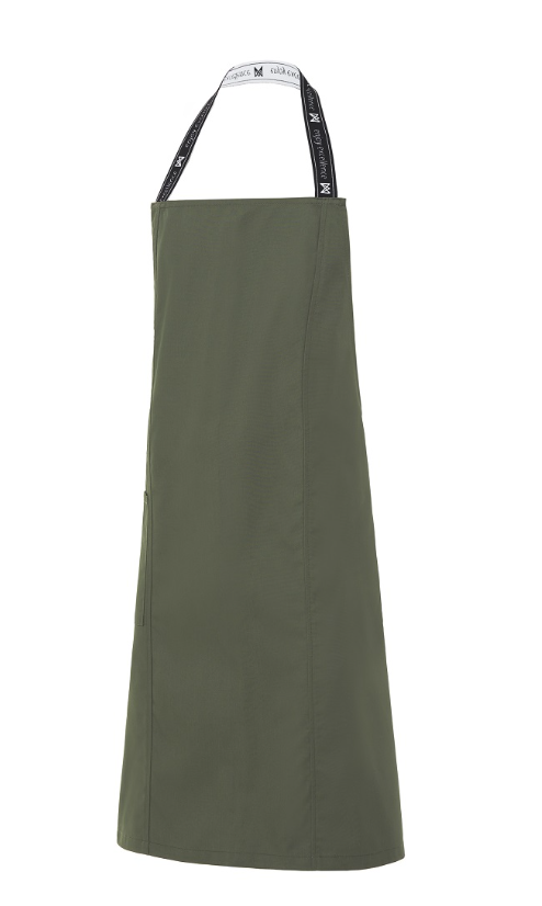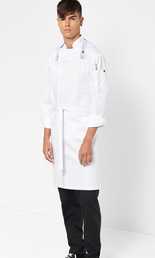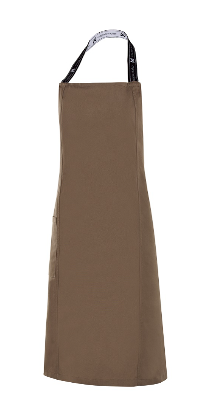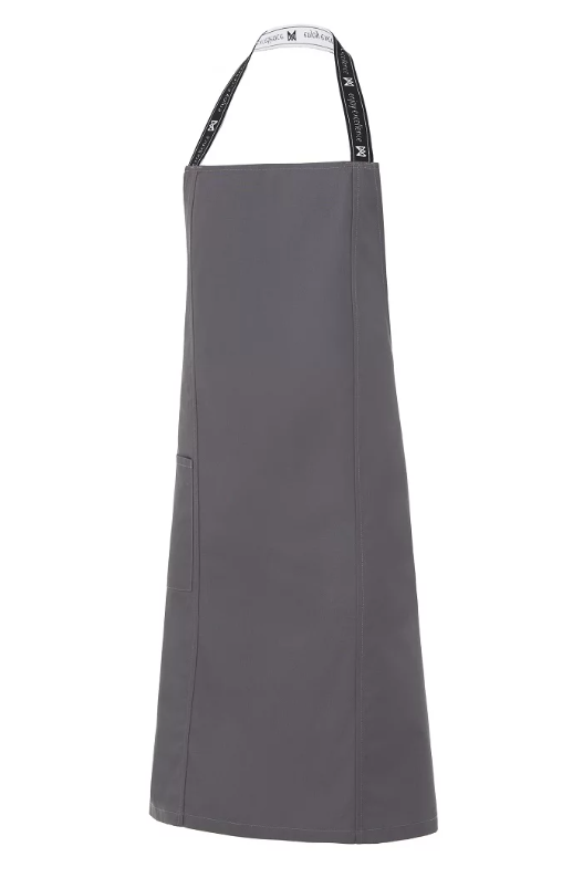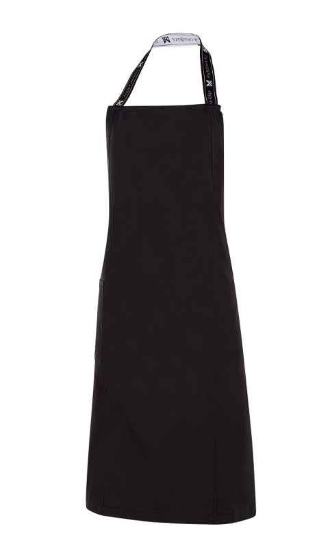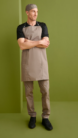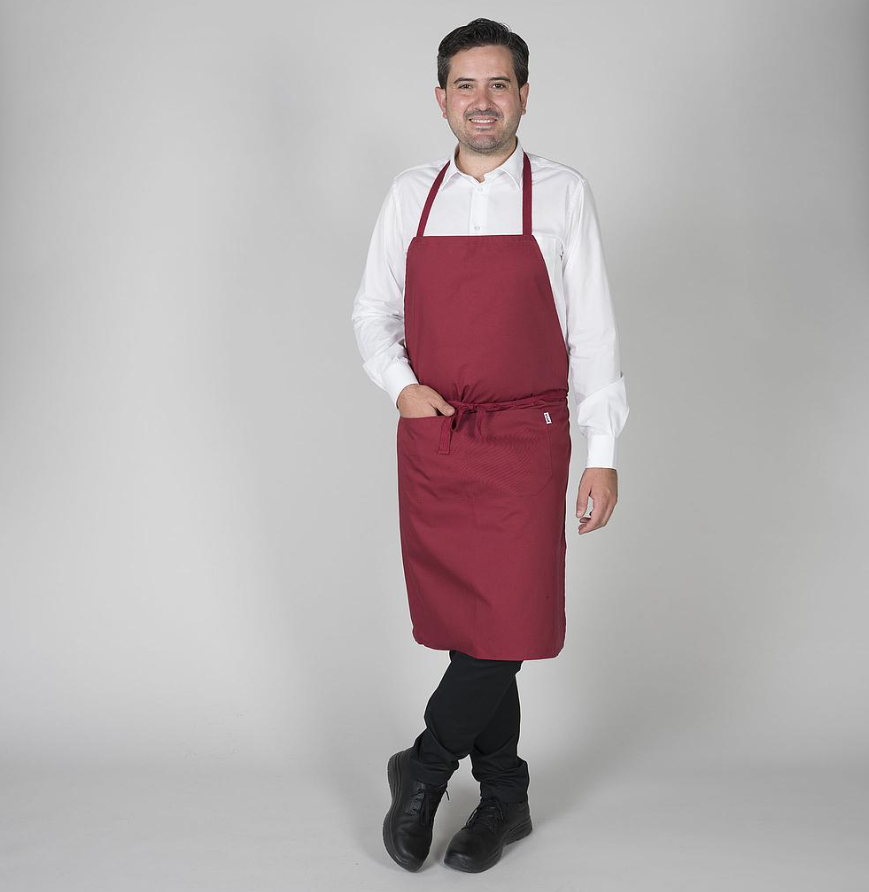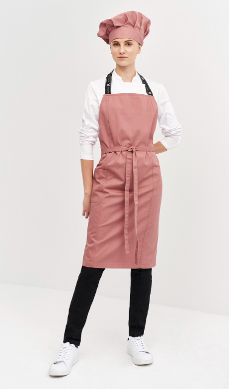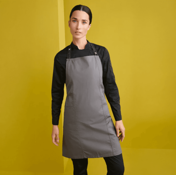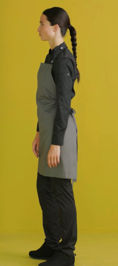 • Delantal de peto, con cortes en el delantero.