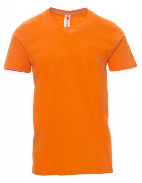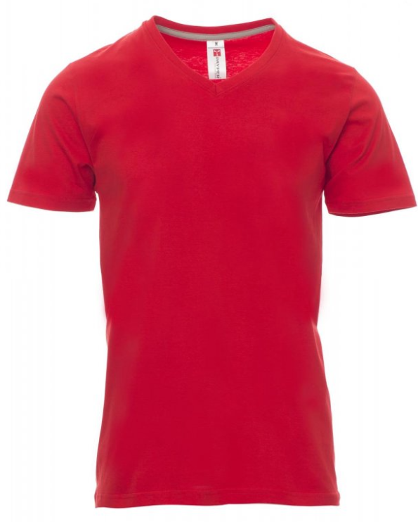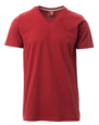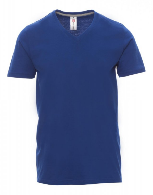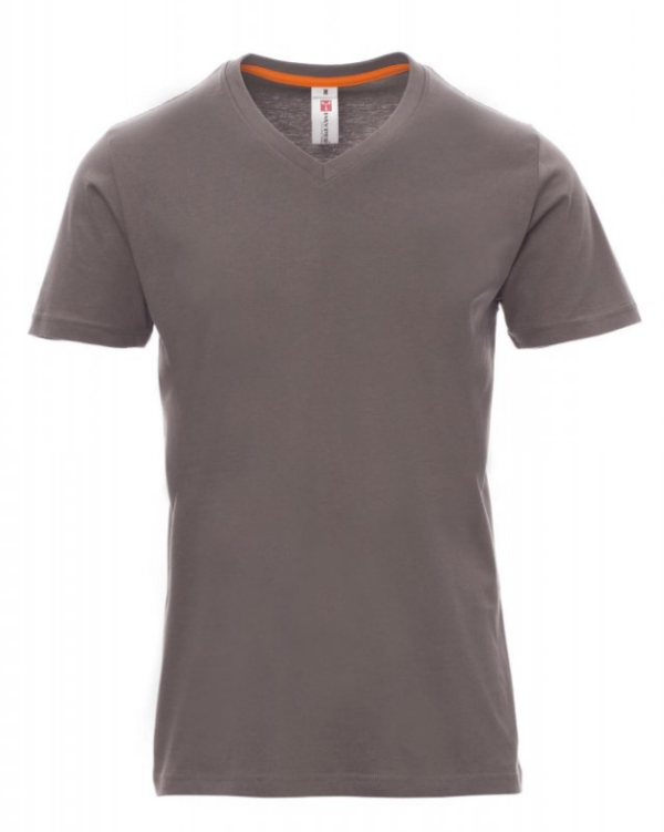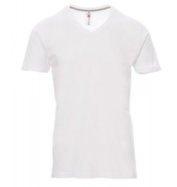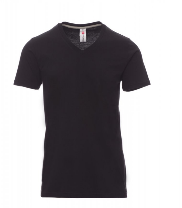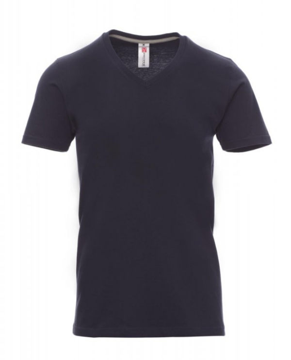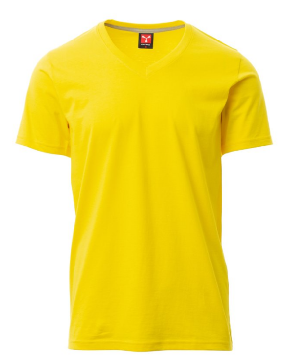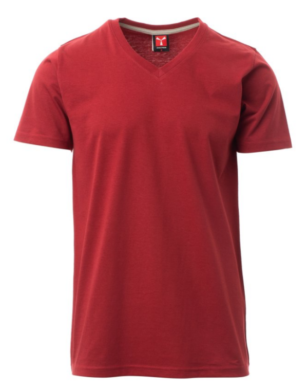 Camiseta de manga corta y cuello de pico para hombre, con banda elástica en cuello de elastano de 1,5 cm con pespunte superior en la parte delantera, cinta de refuerzo de contraste de hombro a hombro visible en la parte interior del cuello, costuras elásticas, diseño tubular.