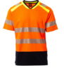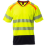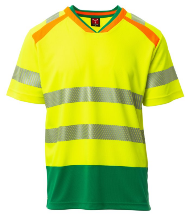 Camiseta bicolor de alta visibilidad, de manga corta, con cuello en V. Cuello de canalé en contraste y costuras cubiertas. Bandas retrorreflectantes segmentadas y termoselladas en hombros, mangas y cintura para facilitar el movimiento. Cinta de refuerzo en color de contraste. Aberturas laterales.