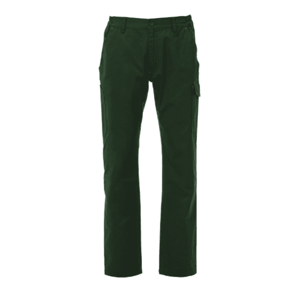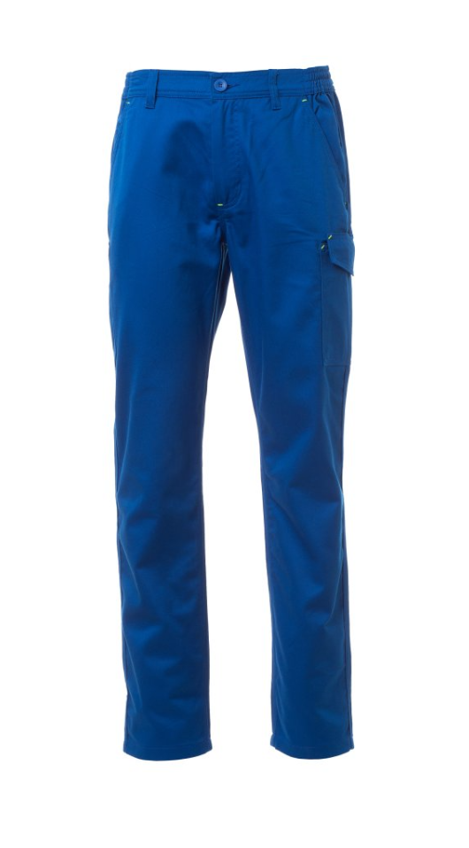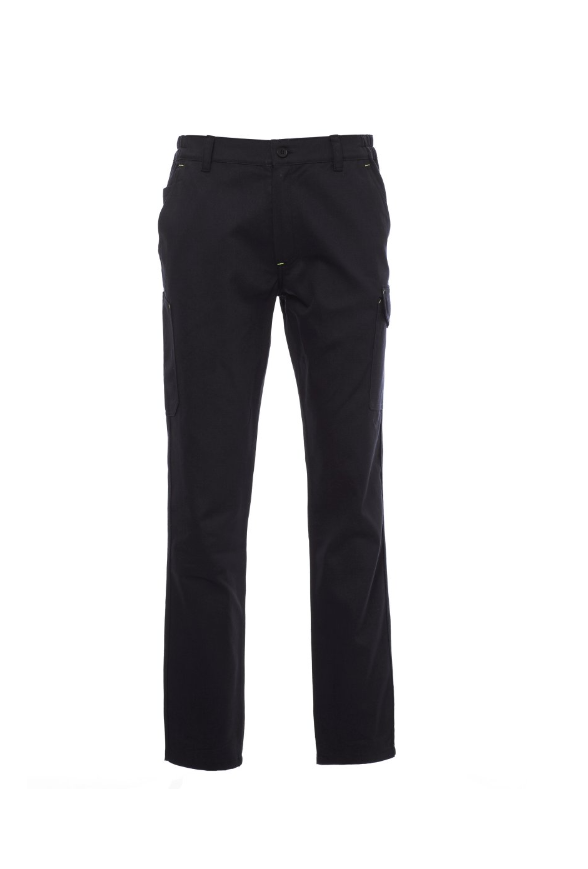 Pantalón con trabillas y elástico en la cintura, cierre con cremallera y botón. Dos bolsillos delanteros de corte clásico, bolsillo pequeño portamonedas, soporte para metro lateral derecho, bolsillo lateral izquierdo con tapeta de cierre LOCK SYSTEM, dos bolsillos posteriores, uno con tapeta y velcro. Costuras de triple aguja.