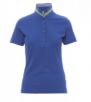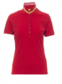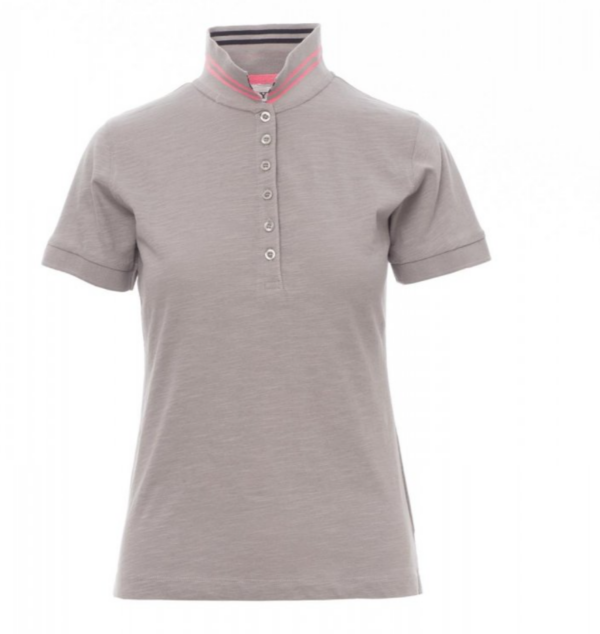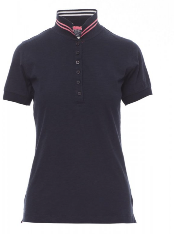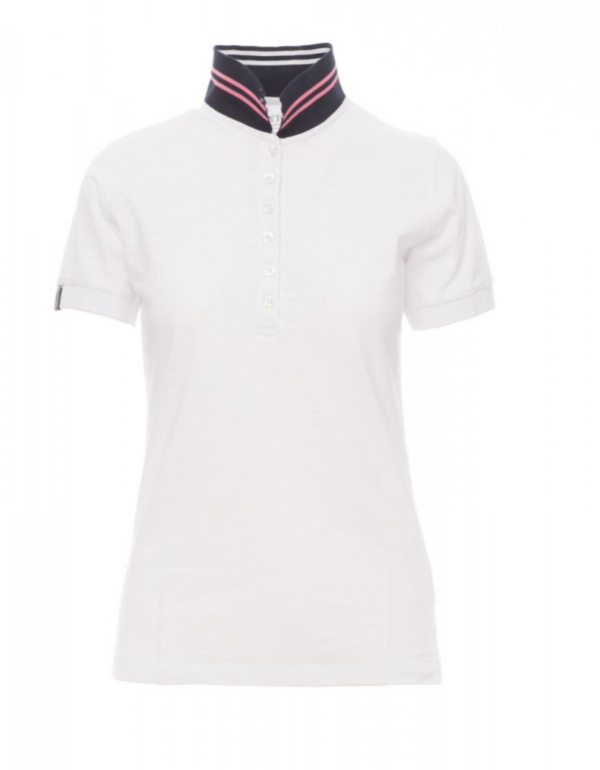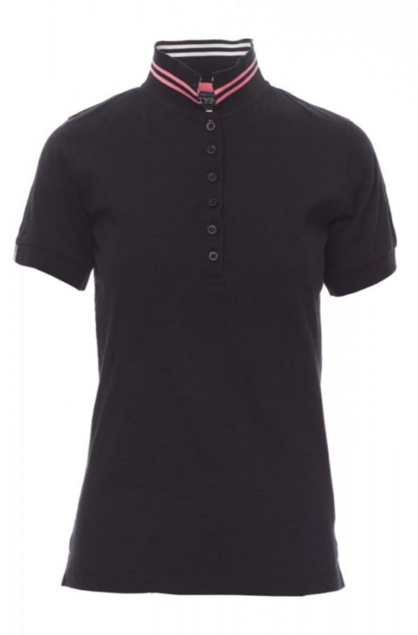 Camiseta polo ceñida de manga corta para mujer con 6 botones efecto nácar a juego, cuello con cintas rayas de contraste y rayas fluorescentes en la parte inferior, cuello y extremo de las mangas elásticos, manga recta con inserción, ventilaciones laterales y pespunte en cuello oculto con cinta fluorescente, etiqueta de transferencia.