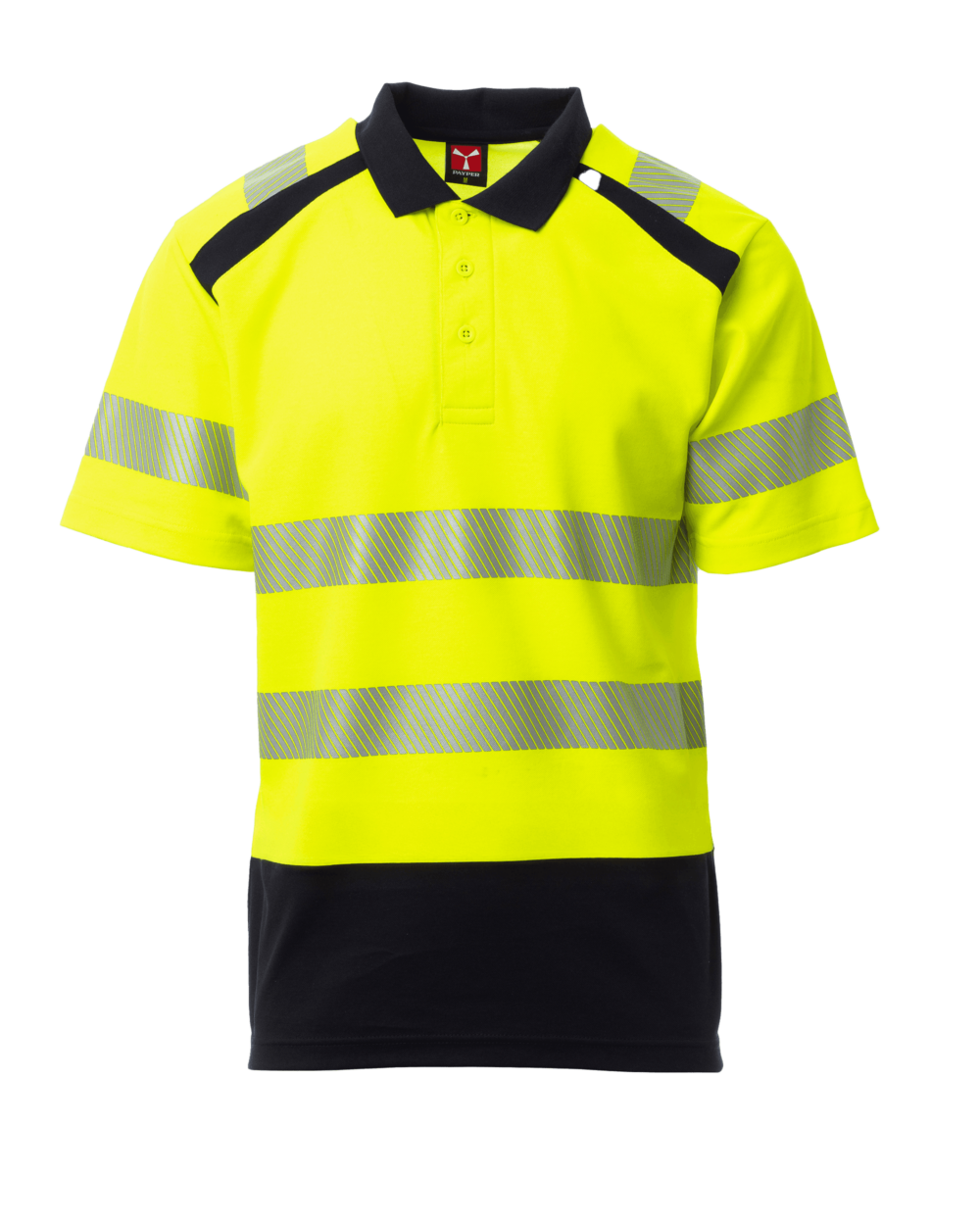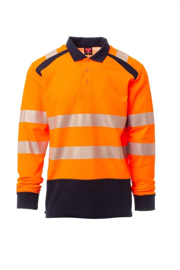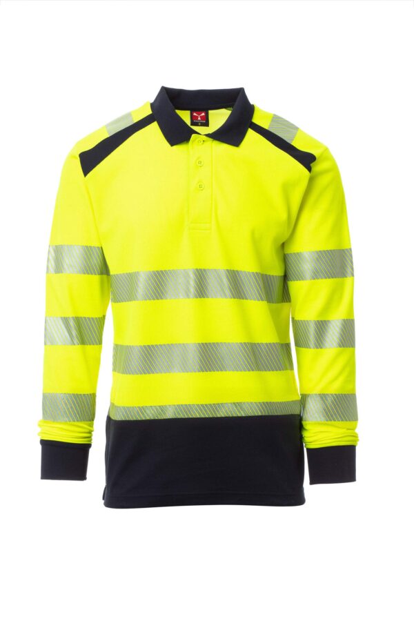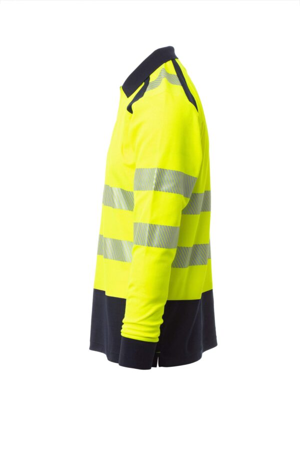 Polo bicolor de alta visibilidad, de manga larga. Cuello con 3 botones, con canalé y costuras cubiertas. Aberturas laterales. Bandas retrorreflectantes segmentadas y termoselladas para facilitar el movimiento. El tejido, confeccionado con algodón en el interior y poliéster en el exterior, garantiza una gran transpirabilidad y comodidad, así como una mayor durabilidad.