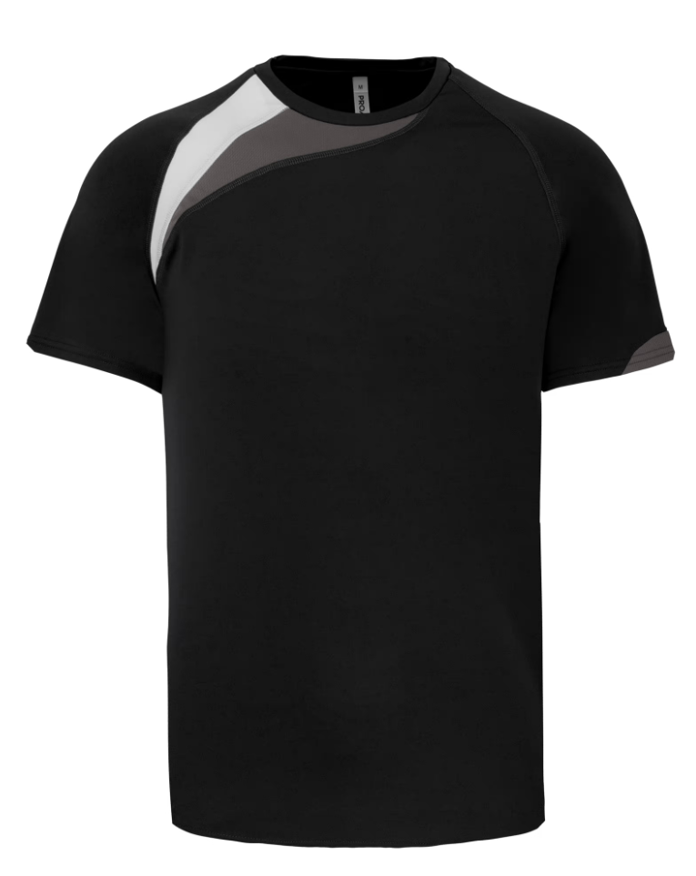 Camiseta de manga corta y cuello redondo para hombre, con banda elástica en cuello de elastano de 1,5 cm con pespunte superior en la parte delantera, cinta de refuerzo de hombro a hombro, costuras elásticas, costuras laterales.