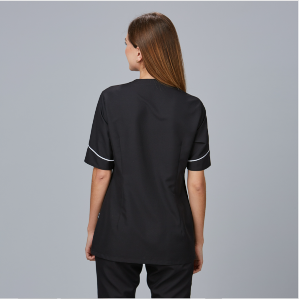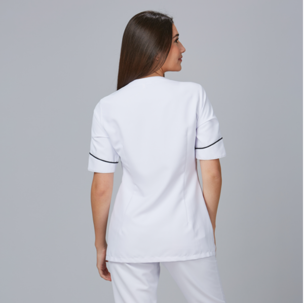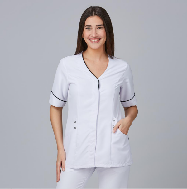 Elegancia y funcionalidad con la Blusa Mujer Cinta, una prenda diseñada para destacar en el exigente entorno de la peluquería y el cuidado personal.