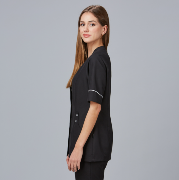 Esta casaca de manga corta presenta un sofisticado cuello pico, dos bolsillos estratégicamente ubicados entre costadillos y un cierre mediante botones de presión ocultos para un look profesional impecable. Su corte semi ajustado, con costadillos delanteros y pinzas en la espalda, asegura un ajuste favorecedor y cómodo.