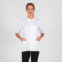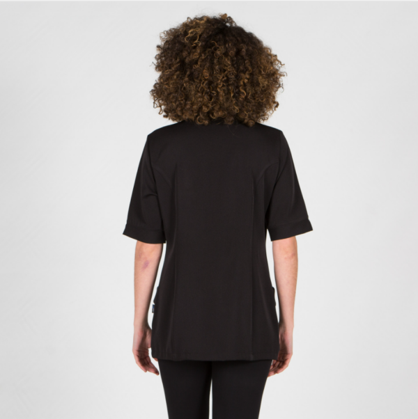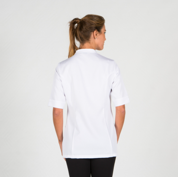 Casaca para mujer en manga corta al codo con aberturas, dos bolsillos entre costadillos, cierre mediante botones de presión ocultos y dos corchetes vistos en el cuello. Prenda semi ajustada, con costadillos en delantero y espalda.