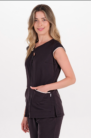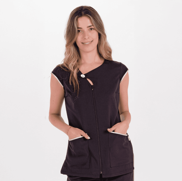 Chaqueta para estética y spa fabricada en microfibra elástica negra. Manga corta japonesa. Detalle en el cuello con botón ovalado acabado madera . Se abrocha con cremallera de malla invertida que evita el deterioro por rozamiento. Vivo raso beige en mangas y bolsillos.