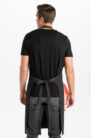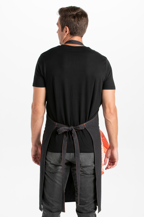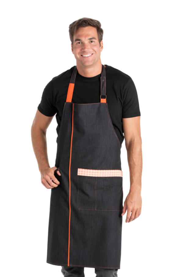 Delantal con peto fabricado en tejano negro con contraste naranja en linea vertical y tirante. Tirante con hebilla regulable con dos corchetes. Amplio bolsillo divisorio combinado con contraste en cuadro naranja fluor. Trabilla a la altura del bolsillo para colgar el trapo. Talla: ÚNICA. Largo 88 cm x 75 cm ancho.Propuestas: bares, terrazas, cafeterías, comercios y restauración en general.