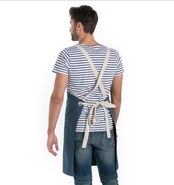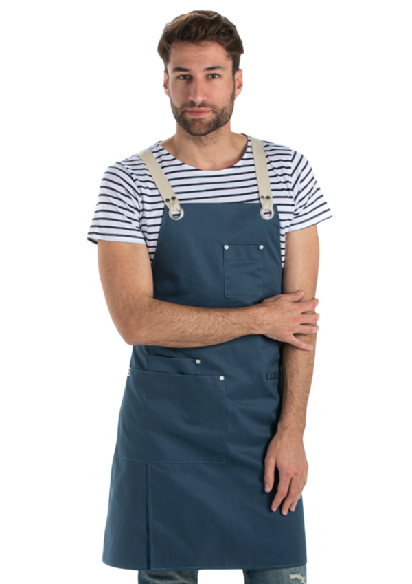 Delantal envolvente con peto en color azul petróleo. Tejido muy resistente 242 gr/m2 con alta solidez a los colores. Bolsillo inferior doble con remaches reforzados. Trabilla lateral para sujetar trapo i cinta interior para colgar el delantal. Se ajusta con cinta espiga beig cruzada atrás con ojales metálicos. Abertura inferior para mayor comodidad. Largo 86 cm x ancho 75 cm.Propuestas: bares, terrazas, cafereterias, comercios y restauración en general.