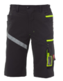 Bermudas unisex, tejido «4 way stretch», con elásticos laterales y trabillas en la cintura, cierre con cremallera y botón personalizado. En el delantero tiene dos bolsillos redondeados, un bolsillo pequeño para monedas a la derecha y un bolsillo pequeño de seguridad cerrado con cremallera a la izquierda. En la parte delantera de la pernera izquierda presenta 3 bolsillos: un bolsillo horizontal cerrado con una cremallera, un bolsillo con tapeta perfilada cerrado con velcro y con soporte para tarjeta de identificación y un bolsillo pequeño vertical cerrado con cremallera. Banda retrorreflectante en la parte delantera de la pernera derecha. En la parte trasera presenta un bolsillo con tapeta cerrado con velcro y un bolsillo sin tapeta pero con 2 bandas retrorreflectantes, una anilla para el martillo (pernera derecha), un bolsillo abierto para el metro (pernera derecha) y un bolsillo para el teléfono móvil con tapeta y velcro (pernera derecha). También presenta pespuntes laterales y costuras de refuerzo en contraste en distintos puntos. En las tallas (italianas) centrales 48-50-52, el interior de la pernera tiene una longitud de 31 cm.