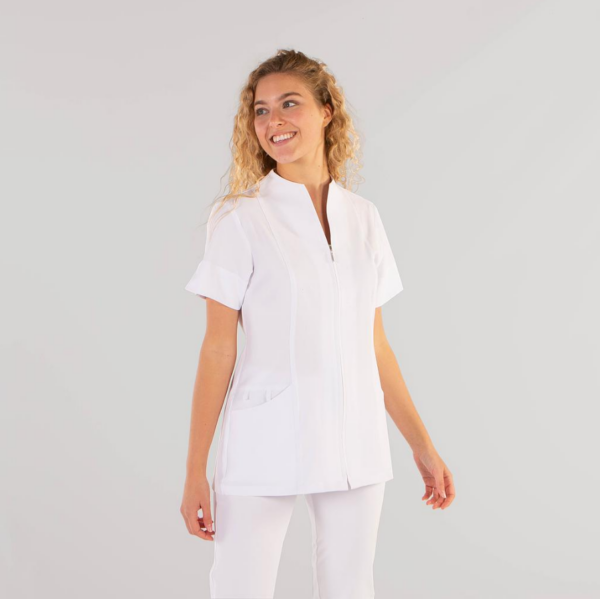 Descubre la elegancia y funcionalidad con la BLUSA ABIERTA MUJER YANIRA, una opción vanguardista para profesionales de la salud. Esta casaca de manga corta, con aberturas laterales, presenta un moderno cuello chimenea y un cierre frontal mediante cremallera, proporcionando comodidad y estilo. La prenda semi ajustada cuenta con costadillos en el delantero y pinzas en la espalda para un ajuste perfecto.