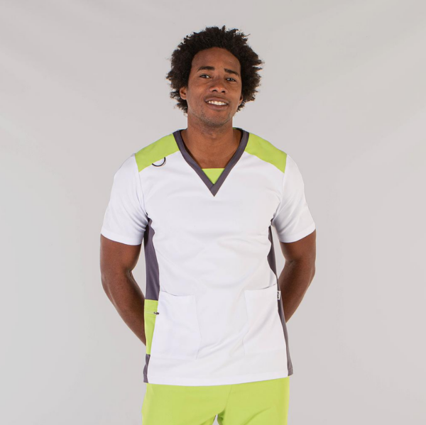 Confeccionada en MICROFIBRA ELASTIK de 99% Poliéster - 1% Elastano, este tejido innovador proporciona máxima libertad de movimiento, es antibacteriano, altamente transpirable y resistente a salpicaduras de lejía. Lavable a 90º, de secado rápido y sin necesidad de planchado, esta casaca es también repelente al cabello y pelo de mascotas. El tejido principal en blanco se combina con detalles en gris y pistacho, acentuados con tejido técnico AEROSILVER en costados y escote.