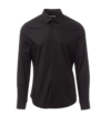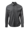 Camisa para hombre de corte entallado. Cuello italiano contorneado sin distancia entre vértices en el pie del cuello y con ballenas extraíbles. Tapeta doblada hacia dentro y botonadura a la vista. Botones con efecto de nácar. Canesú liso en la espalda. Pinzas de entalle en la parte media de la espalda. Costados cerrados con mosca de tejido. Puños redondeados con 2 botones.