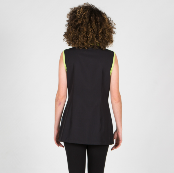 Casaca para mujer sin mangas, con cuello tirilla, escote en pico, un bolsillo de vivo lateral y cierre mediante botones de presión vistos desplazados al lado izquierdo. Prenda semi ajustada, con pinzas en el pecho y en la espalda.