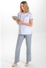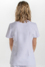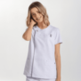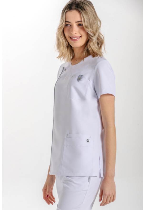Casaca de mujer para comercio y sanidad. Manga corta. Cuello con abertura de corchete. Fabricada en microfibra blanca con contraste en tapeta en gris cemento. Tiene tres bolsillos inferiores y uno superior con presilla y corchete. Muy ligera, suave, seca rápido y es de fácil planchado.
