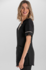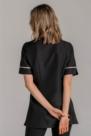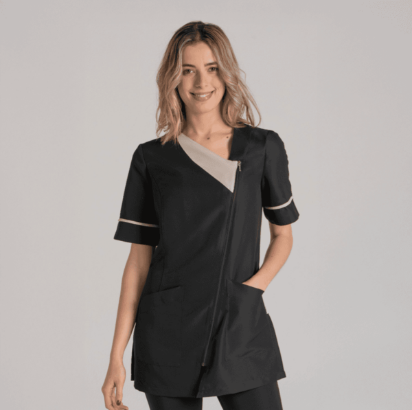 Levita de manga corta en microfibra negra. Diseño con solapa en diagonal. Contraste beige en solapa y vivos de mangas. Dos bolsillos inferiores. Se abrocha con cremallera . Largo: 79 cm. Aberturas laterales inferiores para mayor comodidad. Prenda muy ligera, suave al tacto, seca rápido y es de fácil planchado.