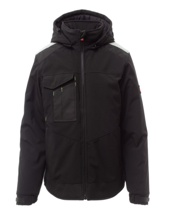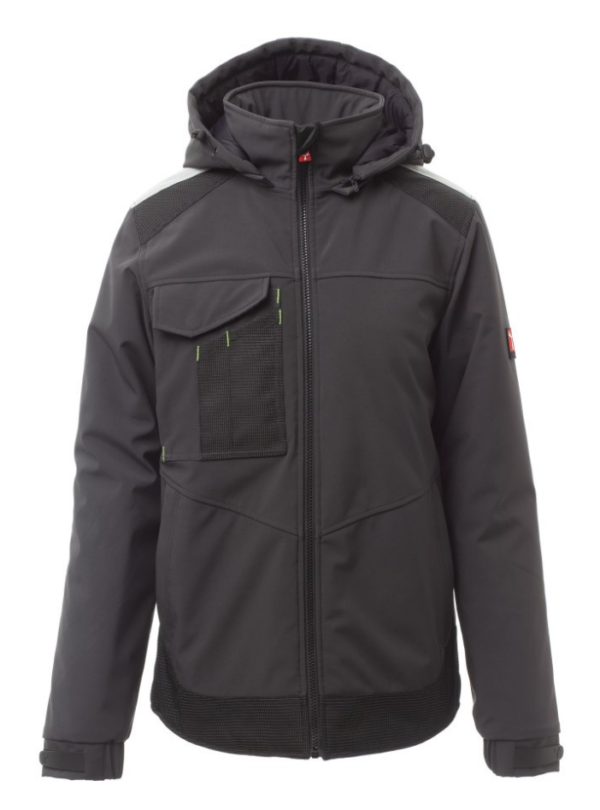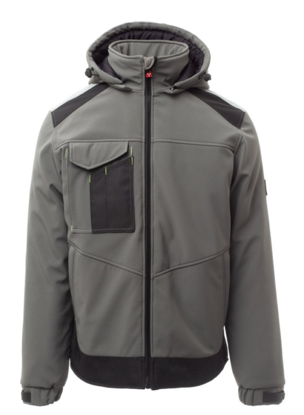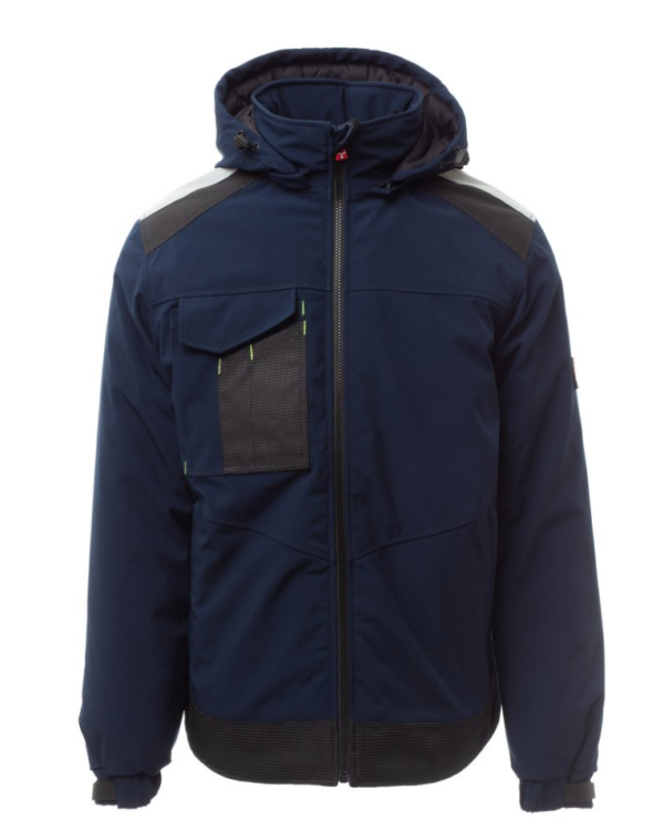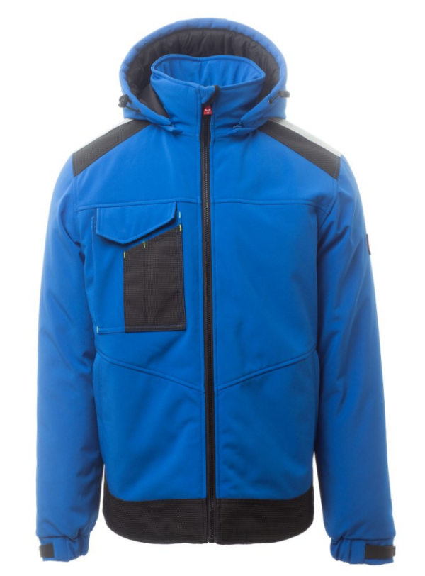 WP 8000 mm H₂O, WVT 5000 g/m² 24h Soft-shell acolchado de hombre, cierre con cremallera con cursor de metal con sistema de bloqueo semiautomático y tirador personalizado. Capucha ajustable con cordón y desmontable. Cinta retrorreflectante en hombros. Puños elásticos ajustables con velcro. Bolsillo en el pecho con Lock System con solapa y alojamiento para bolígrafos. Dos bolsillos laterales cerrados con cremallera. Dos bolsillos interiores, uno de los cuales con compartimento para tableta cerrado con velcro y otro contorneado con cremallera a la altura del pecho derecho. Bajo ajustable con topes personalizados y banda reflectante en la espalda.