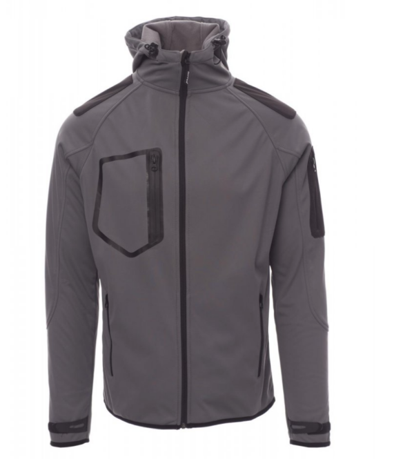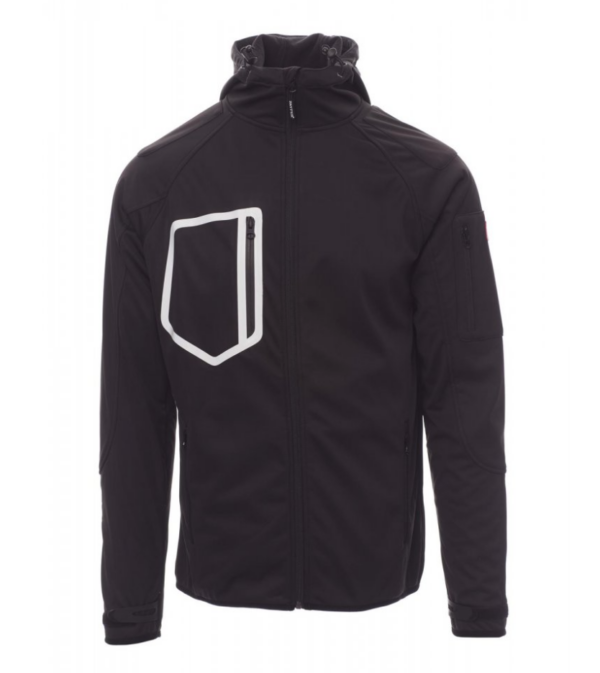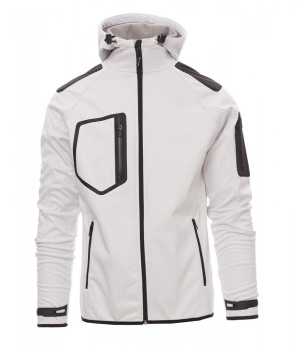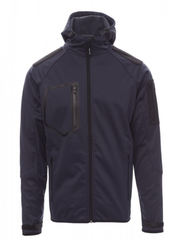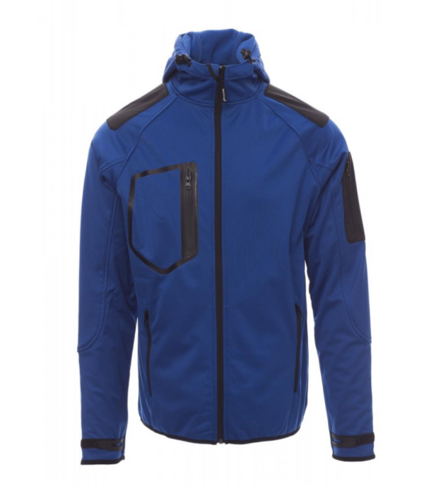 WP 8000 mm H₂O, WVT 5000 g/m² 24h. Chaqueta ergonómica para hombre, manga rangán, capucha contorneada con dos costuras y cordón, con cremallera SBS larga con cinta, puños ajustables con cierre cauchutado y de velcro, borde fino en los pulsos y en la cintura, dos bolsillos laterales con cremallera, bolsillo a la altura del pecho y un bolsillo en el lado izquierdo.