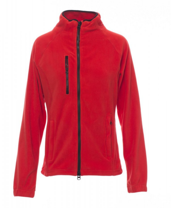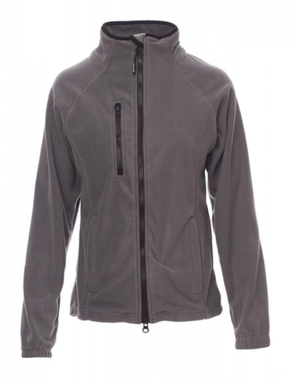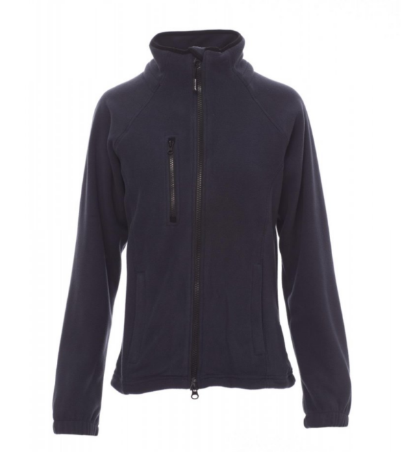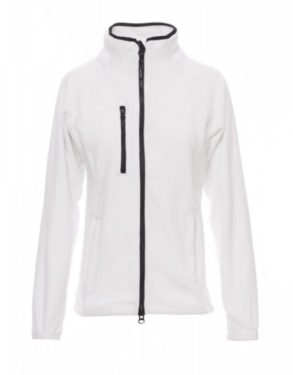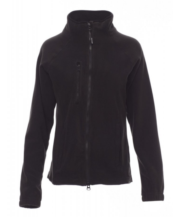 Forro polar ceñido para mujer, con cremallera de 8 mm de plástico negra, mangas ranglán, cordón ajustable en la cintura, puños elásticos, dos bolsillos con cremallera oculta, un bolsillo delantero con cremallera, cuello con cinta de refuerzo de contraste, costuras reforzadas.