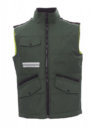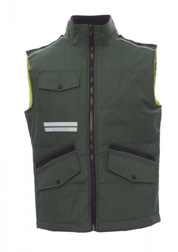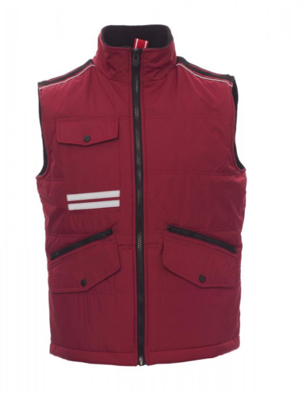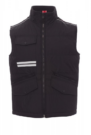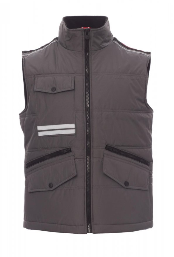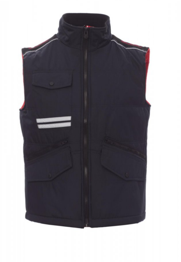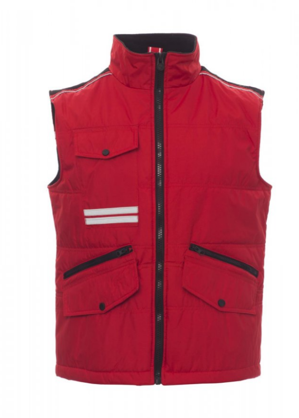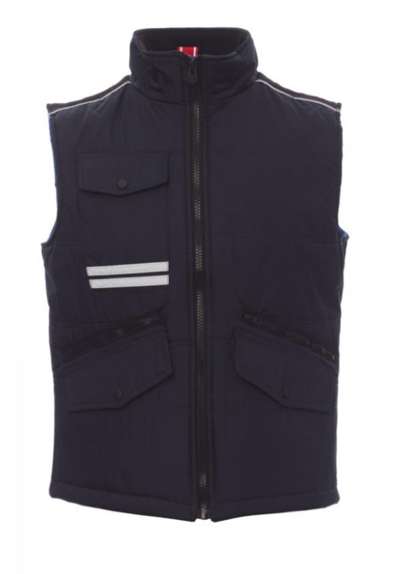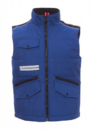 Chaleco unisex, cremallera de 8 mm de plástico con cursor de metal con tapeta y botones de plástico, parte posterior contorneada, dos bolsillos exteriores LOCK SYSTEM y dos bolsillos con cremallera, bolsillos sesgados para fácil acceso, un bolsillo a la altura del pecho para smartphone y anilla de soporte para tarjeta de identificación, bandas reflectantes en el bolsillo y en la parte trasera. Interior: acolchado, forro polar de contraste en espalda y cuello, un bolsillo, cremallera interior para facilitar la impresión y el bordado.